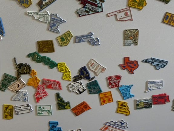 My parents collect all the state shaped magnets from all the states they have visited since they got married 41 years ago. We love magnets too, but we have gone a different direction. When my husband visited New York City, he brought back a magnet from the subway line that he rode while on his trip. Magnets are inexpensive and easily displayed.